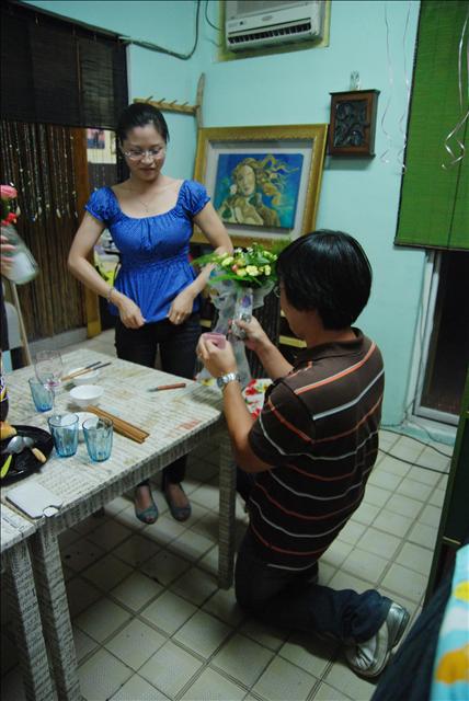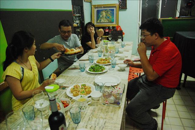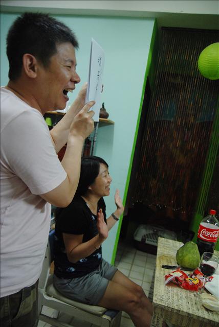 客人們帶來飲料、點心、水果,感謝匡叔提供紅酒,又是豐盛一餐。但是,男主角打電話告知:「女主角不來了!」